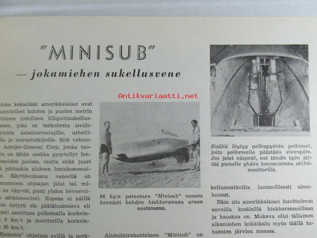 Tekniikan Maailma 1954 nr 5, sis. mm. seur. artikkelit / kuvat / mainokset; Kansikuvassa Frankfurtin messu-uutuus sähköraketti, "Minisub" jokamiehen sukellusvene,
