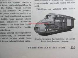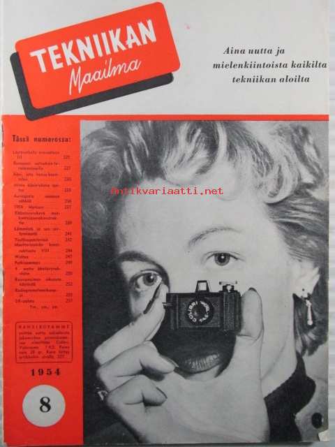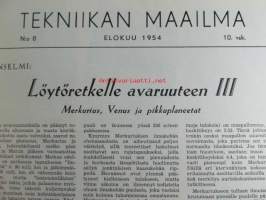 Tekniikan Maailma 1954 nr 8, sis. mm. seur. artikkelit / kuvat / mainokset; Kannessa pienoiskamera Colibri, Kameran sähkömagneettinen laukaisija, 4W äänilevyvahvistin, Putkisummerin tekninen piirustus ja osaluettelo, TM Koekuvaa Weltax paljekamera, Käänteentekevä matkustajajunakonstruktio, Koeajossa 1954 Mercury Monterey, Auringosta suoraan sähköä - käänteentekevä keksintö Amerikassa, Avaruuden ihmesilmä 5 metrin jättiläispeiliteleskooppi, Hagalundin radioasema, Löytöretkeily avaruuteen - Merkurius, Venus ja pikkuplaneetat, ym. katso sisältö kuvista tarkemmin.