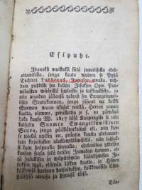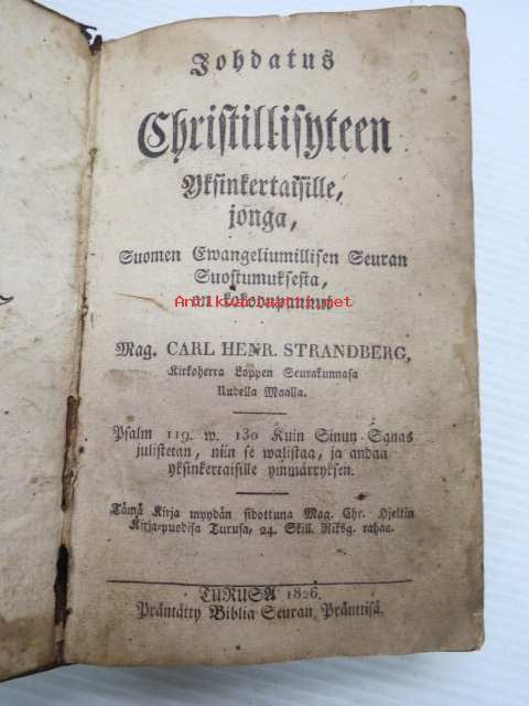 Johdatus Christillisyteen Yksinkertaisille, jonga, Suomen Ewangeliumillisen Seuran Suostumuksesta, on kokoonpannut Mag. Carl Henr. Strandberg, Kirkkoherra Loppen Seurakunnasa Uudella Maalla. Turusa 1826. Präntatty Biblia Seuran Pränttisä.
