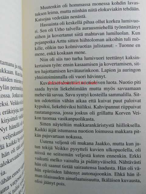 | Saatavilla | 1 kpl | | Julkaisuvuosi | 2001 | | Sivuja | 189 | | Kunto | K2 | | Sidonta/painoasu | Nidottu (pehmeäk.) | | ISBN | 952-464-006-6 | | Kielet | Suomi |
