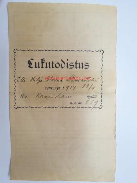 Lukutodistus - Lastenkoulutodistus, Lukukinkeritodistus 1930, Elli Hilja Iloona Savimäki, Kumilan kylä " "Hyväksytty rippikouluun"