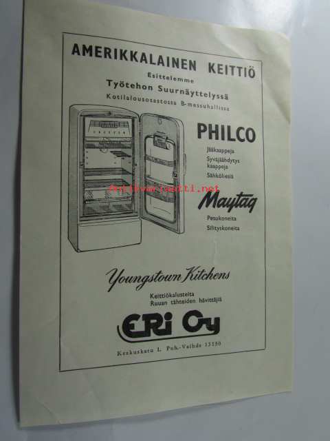 Iskumetalli OyAmerikkalainen keittiö esittelemme Työtehoseuran Suurnäyttelyssä Philco jääkaappeja, syväjäädytyskaappeja, sähköliesiä, Maytag pesukoneita, silityskoneita, Youngstown Kitchens keittiökalusteita, ruoan tähteiden hävittäjiä myyntiesite Eri Oy