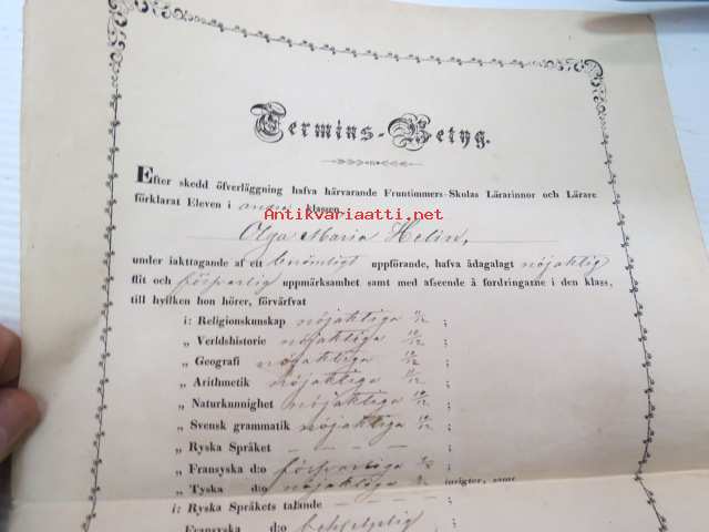 Termins-Betyg - Efter skedd öfverläggning haffa härvarande Fruntimmers-Skolas Lärarinnor och Lärare förklarat eleven... Olga Maria Helin...Åbo den 14de