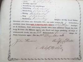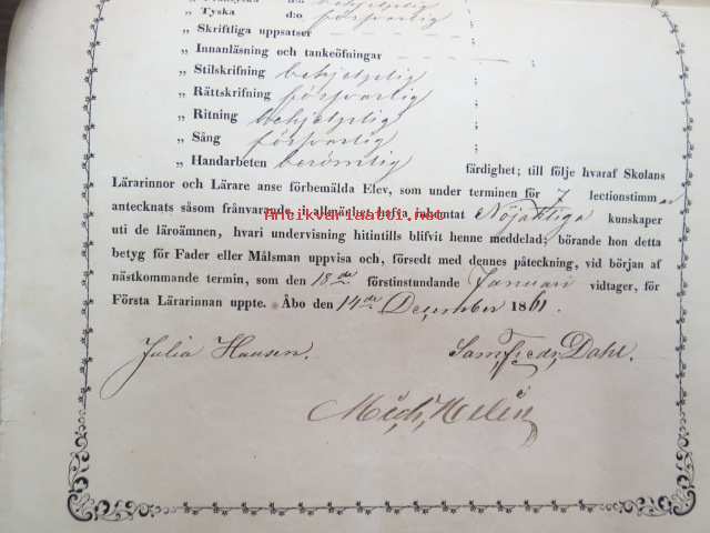 Termins-Betyg - Efter skedd öfverläggning haffa härvarande Fruntimmers-Skolas Lärarinnor och Lärare förklarat eleven... Olga Maria Helin...Åbo den 14de December 1861 -koulutodistus