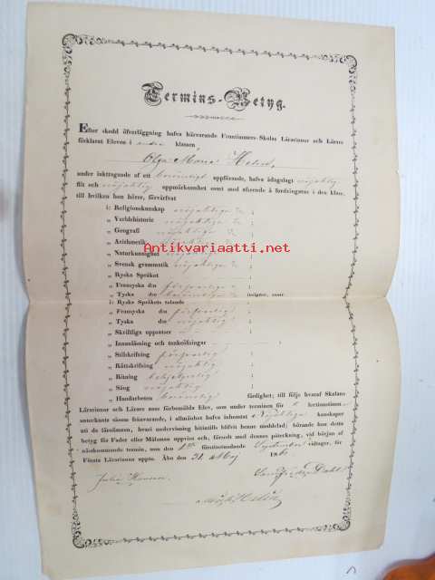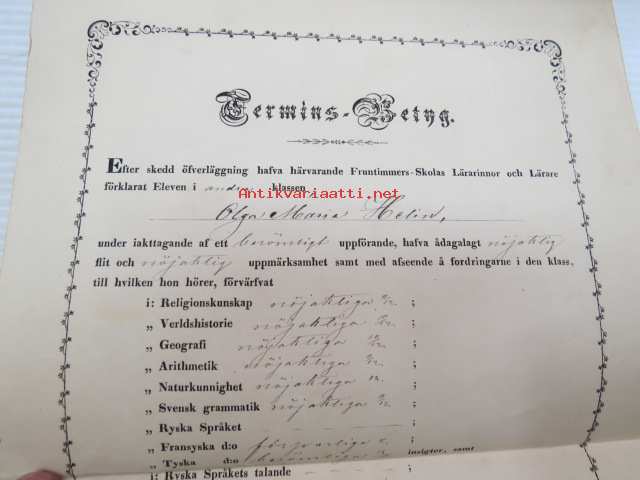 Termins-Betyg - Efter skedd öfverläggning haffa härvarande Fruntimmers-Skolas Lärarinnor och Lärare förklarat eleven... Olga Maria Helin...Åbo den 31. Maj