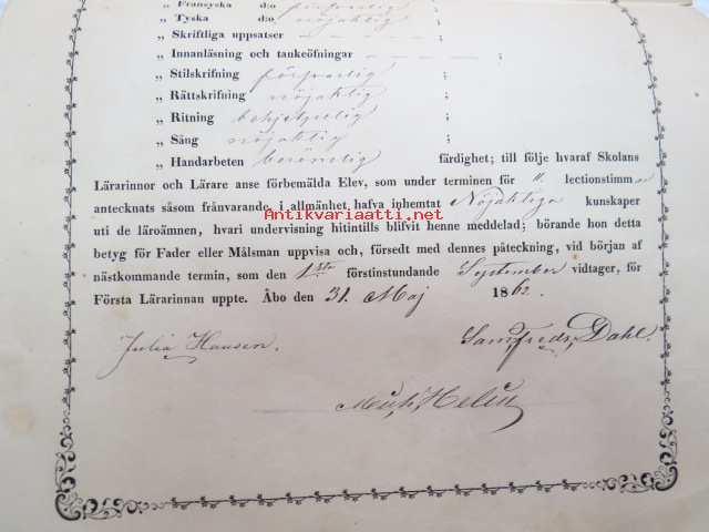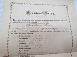 Termins-Betyg - Efter skedd öfverläggning haffa härvarande Fruntimmers-Skolas Lärarinnor och Lärare förklarat eleven... Olga Maria Helin...Åbo den 31. Maj 1862 -koulutodistus