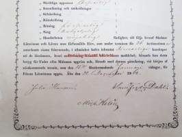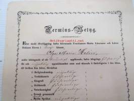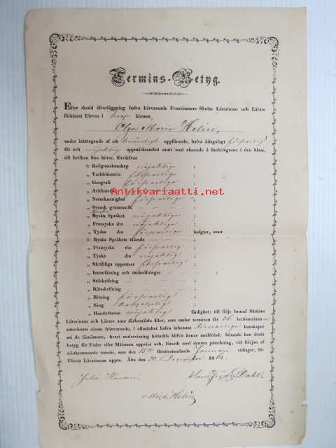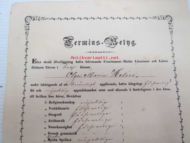 Termins-Betyg - Efter skedd öfverläggning haffa härvarande Fruntimmers-Skolas Lärarinnor och Lärare förklarat eleven... Olga Maria Helin...Åbo den 20.