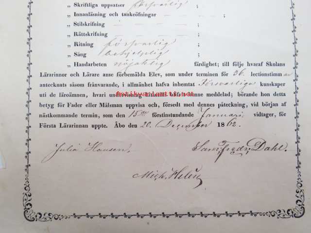Termins-Betyg - Efter skedd öfverläggning haffa härvarande Fruntimmers-Skolas Lärarinnor och Lärare förklarat eleven... Olga Maria Helin...Åbo den 20. December 1862 -koulutodistus