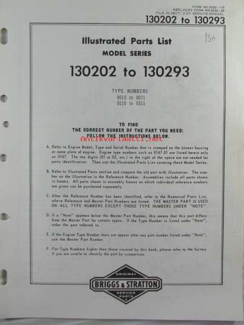 Briggs & Stratton Illustrated Parts List model series 130202 to 130293 Type numbers 0010 to 0071 / 0110 0311 - Varaosaluettelo