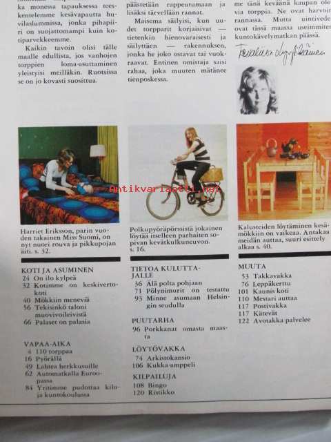 Avotakka 1972 nr 4, Miss Suomi Harriet Erikson ja Martti Etelävuori - kotimme on keskivertokoti, Palaset, pyörällä