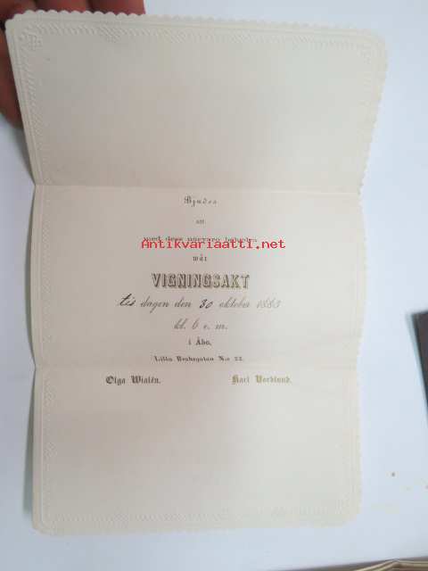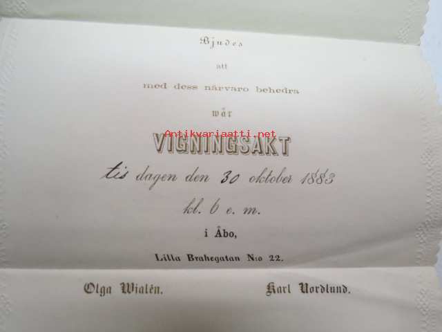 Bjudes att med dess närvaro behedra wår vigningsakt tisdagen den 30 oktober 1883 i Åbo, Lilla Brahegatan nr 22, Olga Wialen, Karl Nordlund-kutsu vihkitilaisuuteen