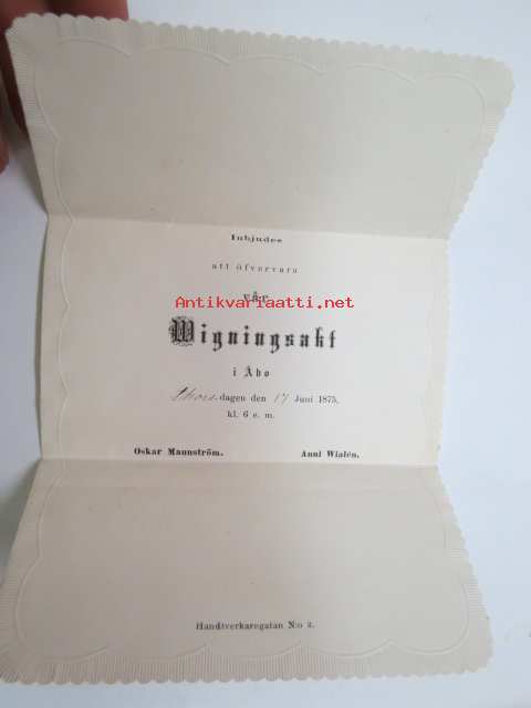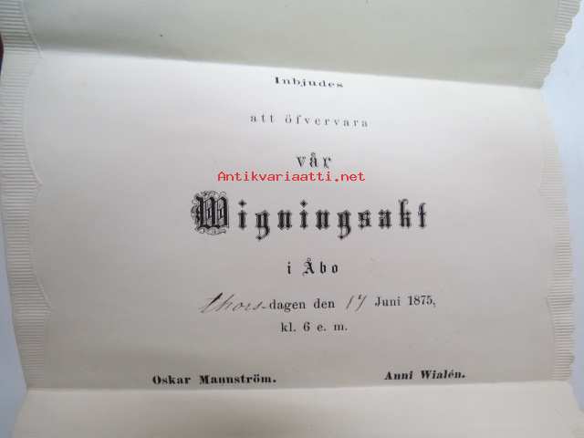 Inbjudes att öfvervara vår Wigningsakt i Åbo thorsdagen den 17 Juni 1875, kl. 6 e.m. Oskar Mannström, Anni Wiallén -kutsu vihkiäisiiin