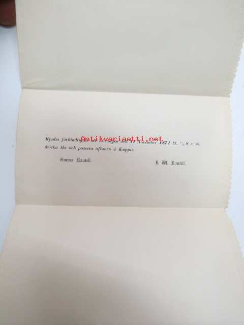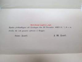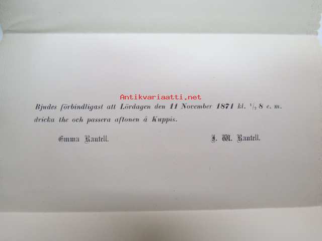 Bjudes förbindligast att Lördagen den 11 November 1871 kl. 1/2 8 e.m. dricka the och passera aftonen å Kuppis- A.M. Rautell -kutsu teetilaisuuteen ja