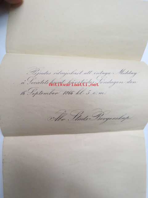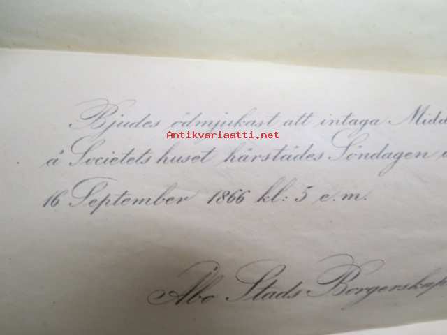 Bjudes ödmjukast att intaga Middag å Societets huset härstädes Söndagen den 16. September 1866 kl. 5 e.m. Åbo Stads Borgerskap -kutsu päivällistilaisuuteen