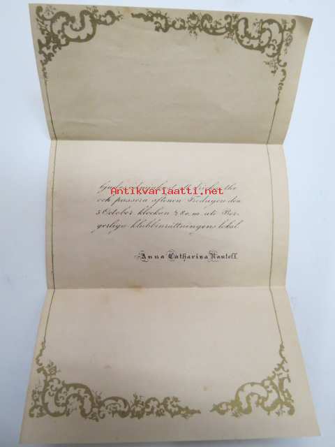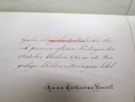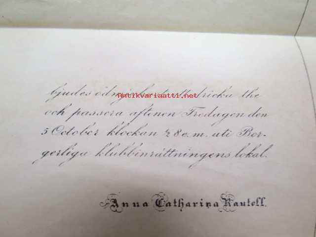 Bjudes ödmjukast att dricka the och passera aftonen Fredagen den 5 October klockan 1/2 8 e.m. uti Bergerliga klubbinrättningens lokal. Anna Catharina Rautell -kutsu illanviettoon