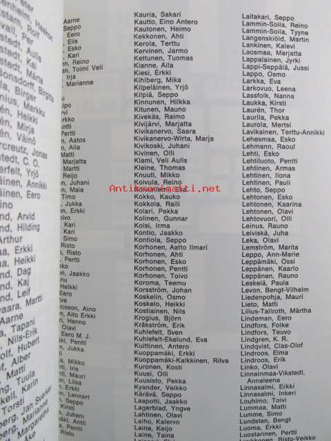 | Saatavilla | 1 kpl | | Julkaisuvuosi | 1972 | | Sivuja | 197 | | Kunto | K2 | | Sidonta/painoasu | Nidottu (pehmeäk.) | | Kielet | Suomi |
