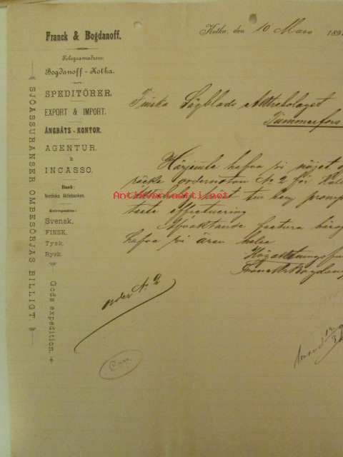 Frank & Bogdanoff, Kotka 10. mars 1896 - asiakirja