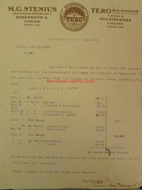 M.G. Stenius TERO Kopenhavn/Helsingfors, Helsingfors 11. september 1912 - asiakirja
