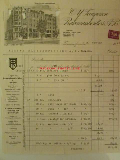 OY. Tampereen Rakennuskonttori AB. Tammerfors 20. oktober 1928 -asiakirja