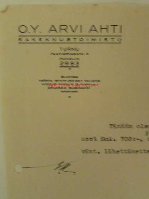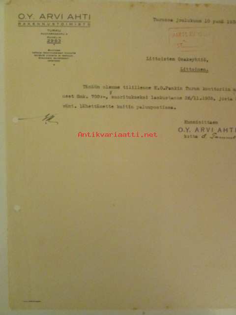 O.Y. Arvi Ahti Rakennustoimisto, Turussa 10. joulukuuta 1935 - asiakirja