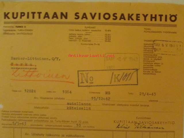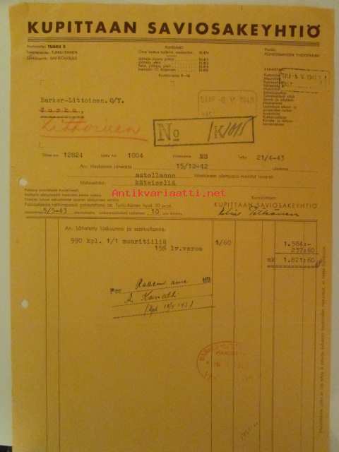 Kupittaan Saviosakeyhtiö, Turku 21.4. 1943 - asiakirja