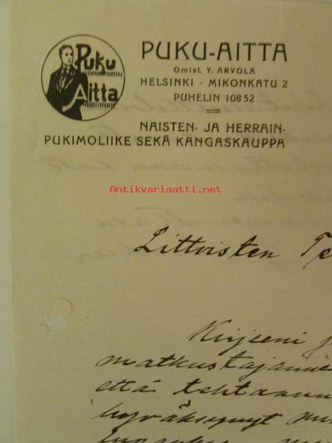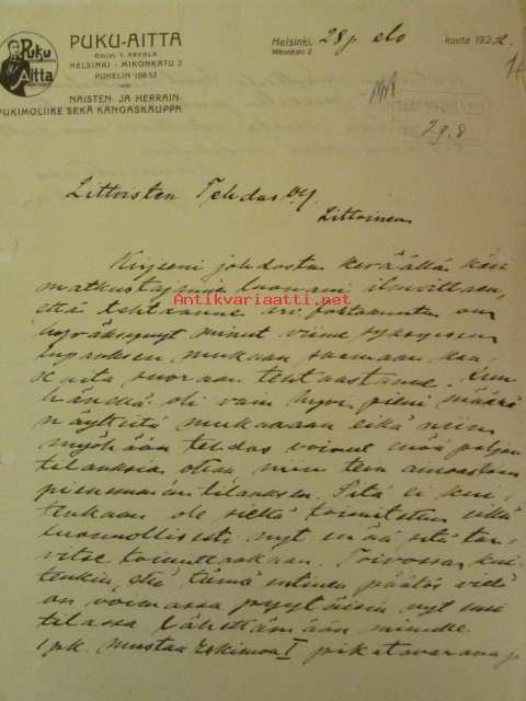 Puku-Aitta, Naisten- ja herrainpukimoliike sekä kangaskauppa, Helsinki 28. elokuuta 1922 - asiakirja