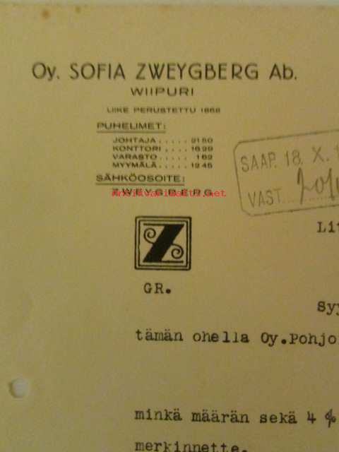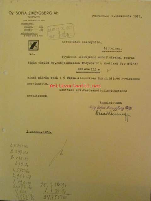 Oy. Sofia Zweygberg Ab, Wiborg, Wiipuri 17. lokakuuta 1927 - asiakirja