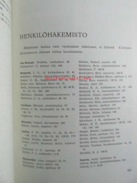 | Saatavilla | 1 kpl | | Julkaisuvuosi | 1969 | | Sivuja | 224 | | Kunto | K3 | | Kansipaperi K2 | | Sidonta/painoasu | Sidottu (kansipaperit) | | Kielet | Suomi |