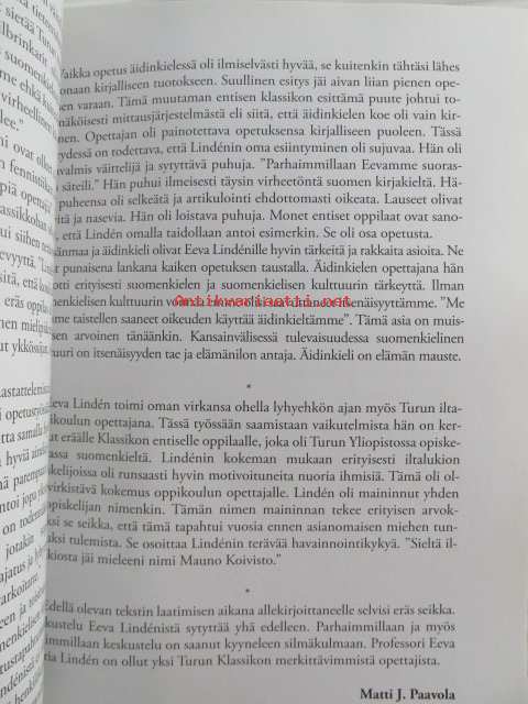 | Saatavilla | 1 kpl | | Julkaisuvuosi | 2006 | | Sivuja | 186 | | Kunto | K2 | | Kärsinyt | | Sidonta/painoasu | Nidottu (pehmeäk.) | | ISBN | 951-9129-67-7 | | Kielet | Suomi |