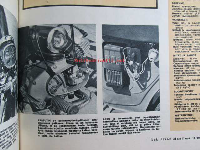 Tekniikan maailma 1965 nr 11, sis. mm. seur. artikkelit / kuvat / mainokset; Keveyttä laminoimalla, Koeajossa Yamaha YF-1 50cc ja YG1-K 80cc, Super 8 uusi kaitafilmikoko, Koeajossa Chevelle Malibu, Purjehdus teknillisenä urheiluna, Auton moottori eilen-tänään-huomenna, , katso sisältö kuvista tarkemmin.21 x 30 cm.