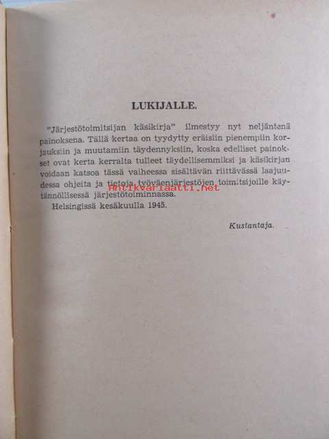 | Saatavilla | 1 kpl | | Julkaisuvuosi | 1945 | | Sivuja | 262 | | Painos | 4. | | Kunto | K2 | | Sidonta/painoasu | Sidottu (kovak.) | | Kielet | Suomi |