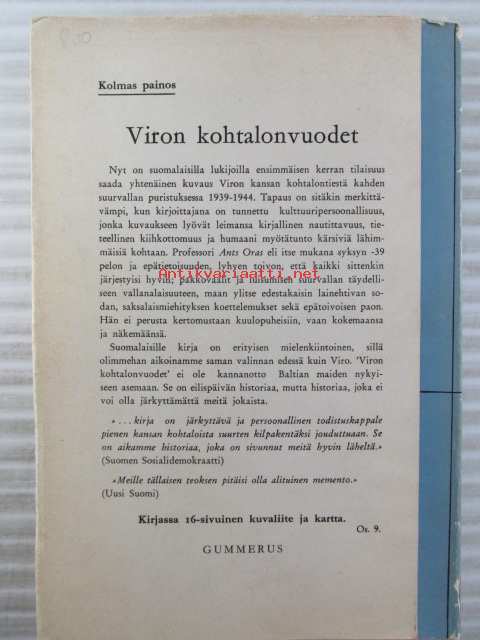 | Saatavilla | 1 kpl | | Julkaisuvuosi | 1959 | | Sivuja | 303 | | Painos | 3 | | Kunto | K2 | | Sidonta/painoasu | Sidottu (kansipaperit) | | Kielet | Suomi |
