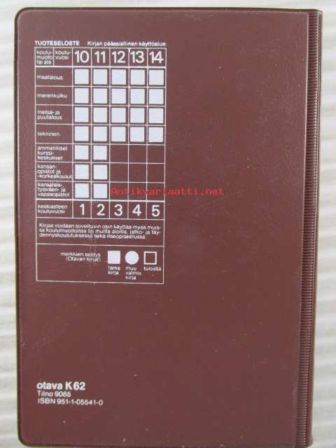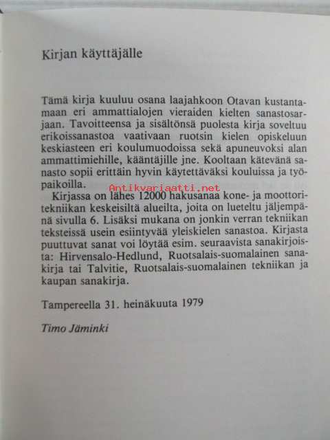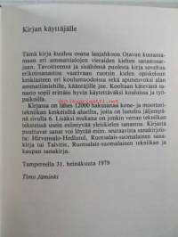 | Saatavilla | 1 kpl | | Julkaisuvuosi | 1980 | | Sivuja | 331 | | Painos | 1. | | Kunto | K3 | | Sidonta/painoasu | Nidottu (pehmeäk.) | | ISBN | 951-1-05541-0 | | Kielet | Suomi, Ruotsi |