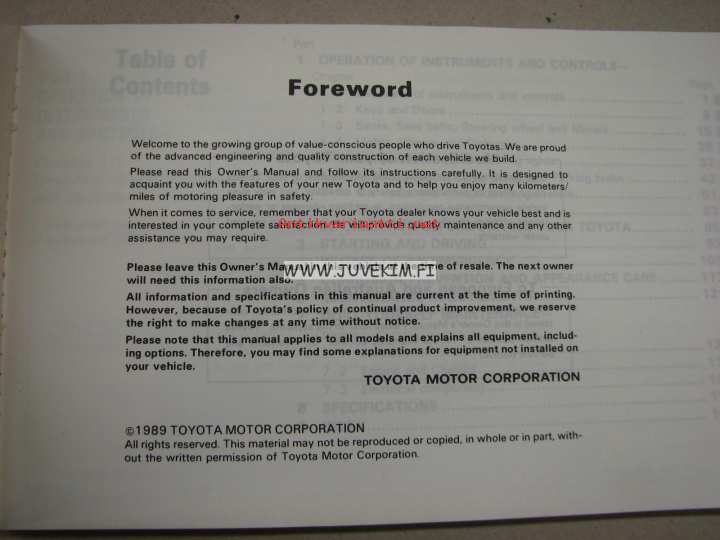 Toyota Motor Co, 198914 x 22 cm ohjekirja.