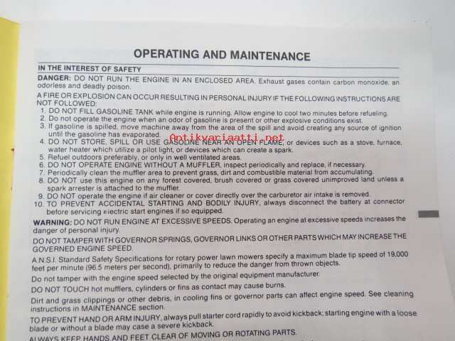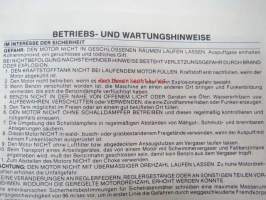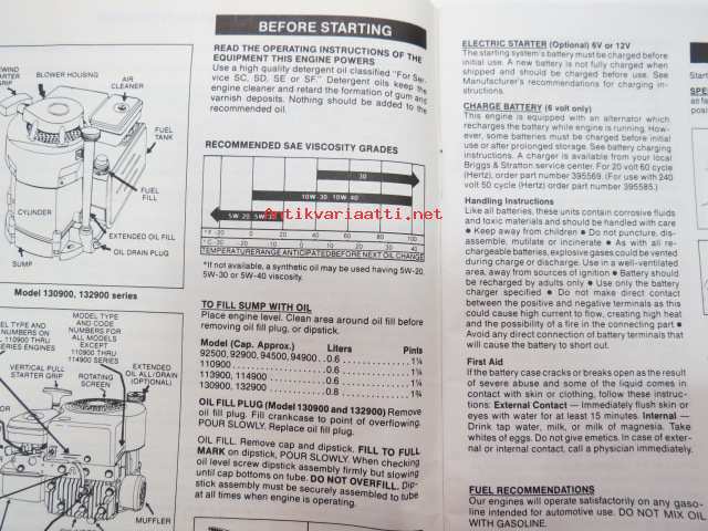 Briggs & Stratton, 1985Briggs & Stratton Operating and maintenance Instructions for Models 92500, 92900, 93500, 94500, 95500, 110900, 111900, 113900, 114900, 130900 & 132900 -käyttöohjeet englanniksi + saksa, italia, ranska, ruotsi