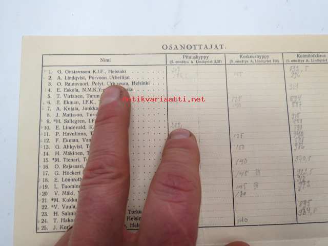 Suomenmestaruuskilpailut vauhdittomissa hypyissä Turussa 16.II.1930 -ohjelma / osanottajaluettelo