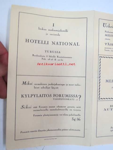 | Saatavilla | 1 kpl | | Julkaisuvuosi | 1930 | | Sivuja | 4 | | Kunto | K3 | | Sidonta/painoasu | Pienpainate | | Kielet | Suomi |