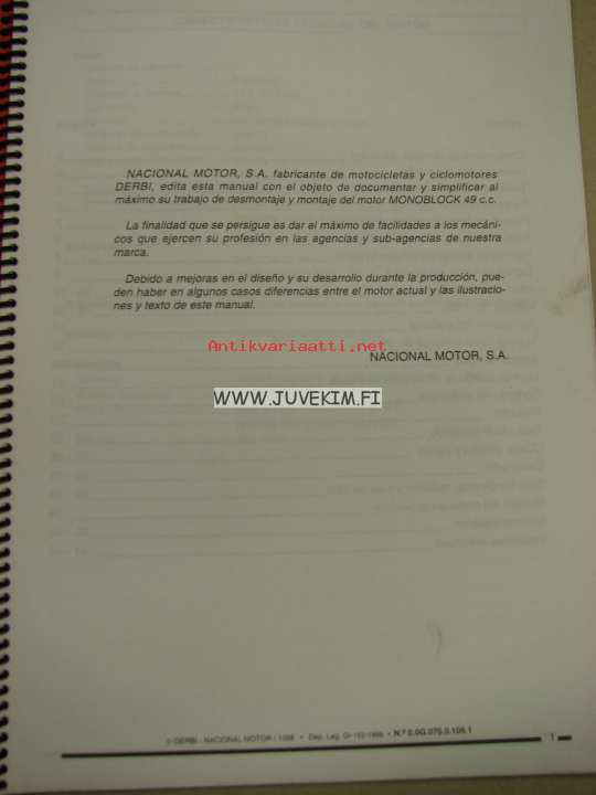 Nacional Motor, SA / Derbi, 1998A-4 kokoinen korjaamokirja.