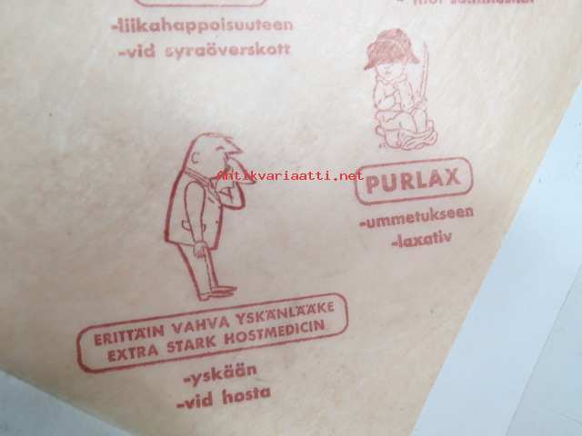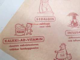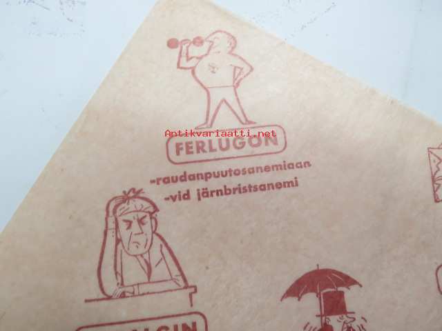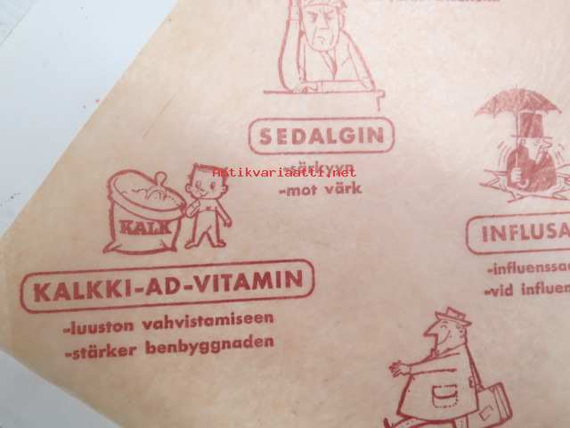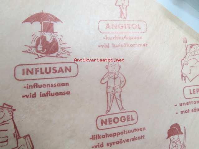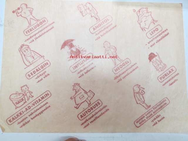 Ferlugon / Sedalgin / Kalkki-AD-Vitamin / Angitol / Influsan / Autobuss / Neogel / Lepo / Purlax -apteekkikäärepaperi