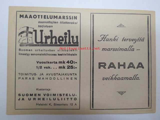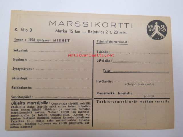 Maaottelumarssi 1941 marssikortti, Kortti nr 3 - miehet maaottelumarssikortti, käyttämätön -unused competition card (marching, between Sweden and Finland in 1941)
