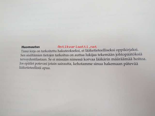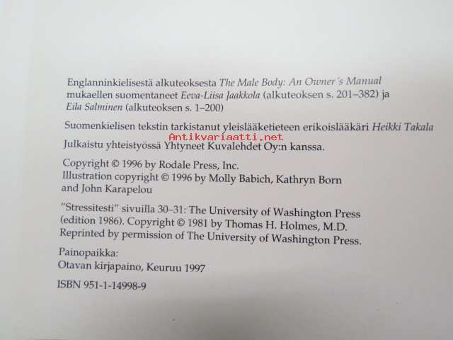 | Saatavilla | 1 kpl | | Julkaisuvuosi | 1997 | | Sivuja | 342 | | Painos | 1. | | Kunto | K3 | | Sidonta/painoasu | Kuvitettu kovakantinen | | ISBN | 951-1-14998-9 | | Kielet | Suomi |