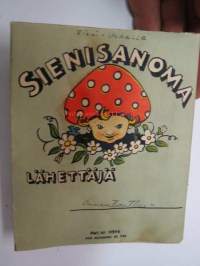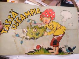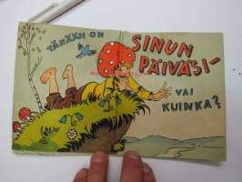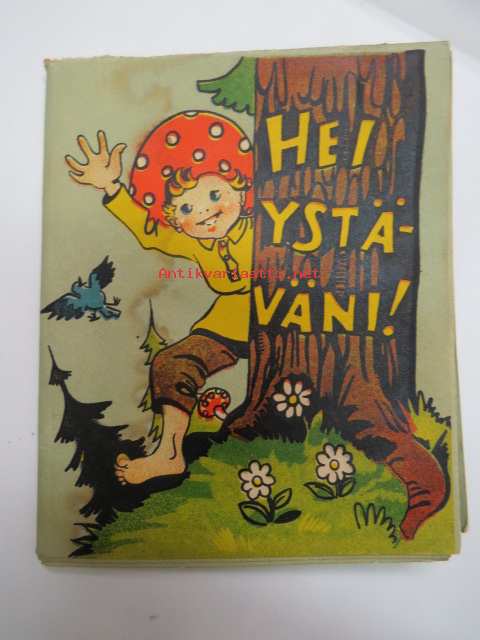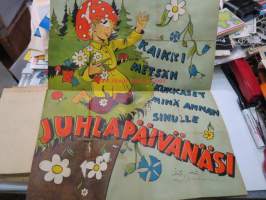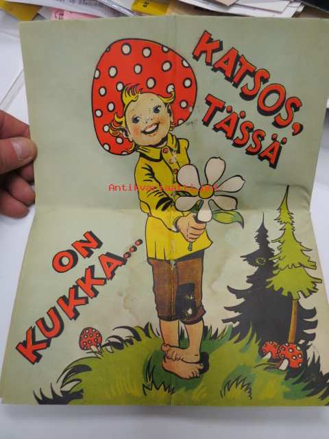 Hei ystäväni! - Tänään on sinun päiväsi - vai kuinka? - Katsos, tässä on kukka... - Tässä useampia... - Kaikki metsän kukkaset minä annan sinulle Juhlapäivänäsi - Sienisanoma - erikoinen taiteltu onnittelusanoma / Uusi Kivipaino Oy TRE