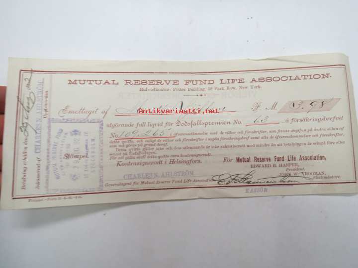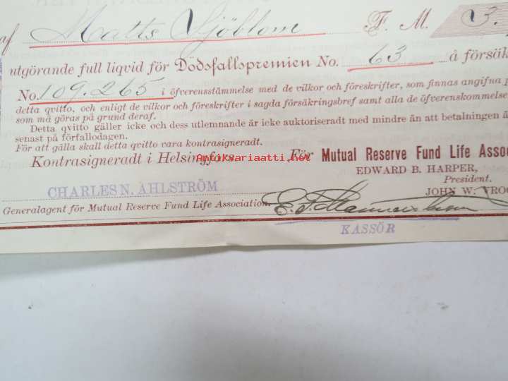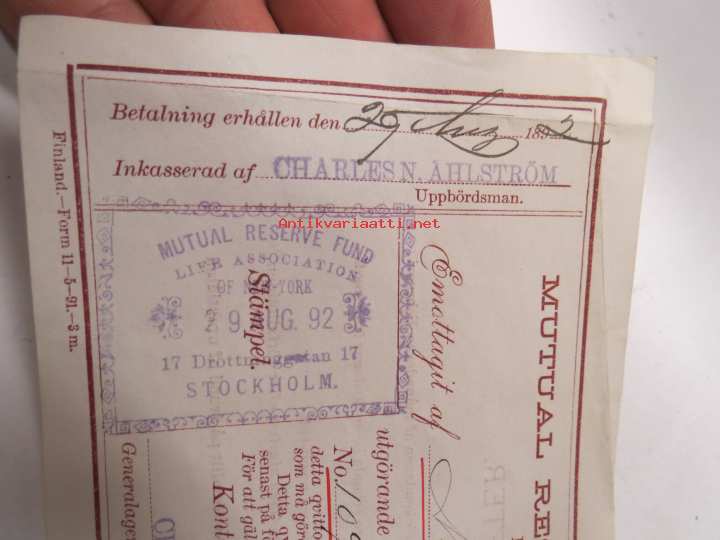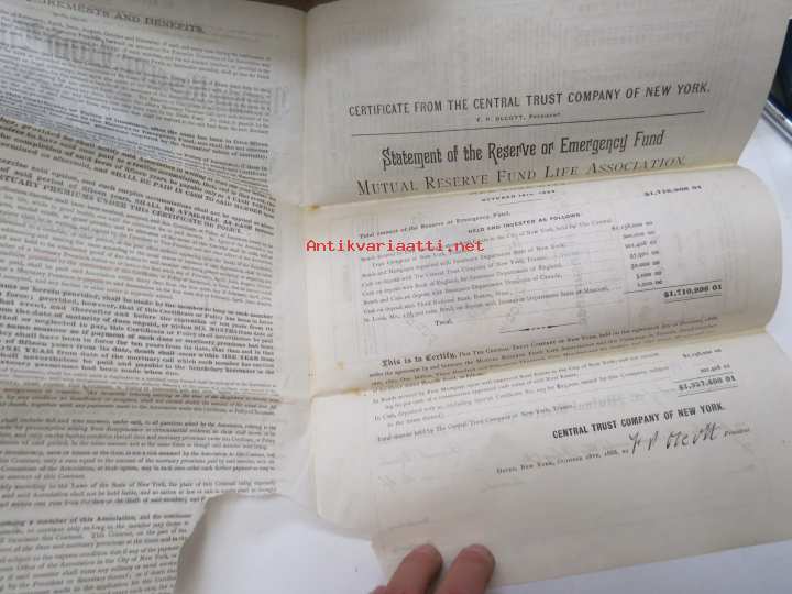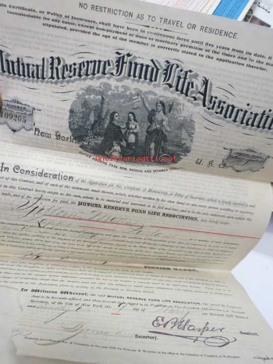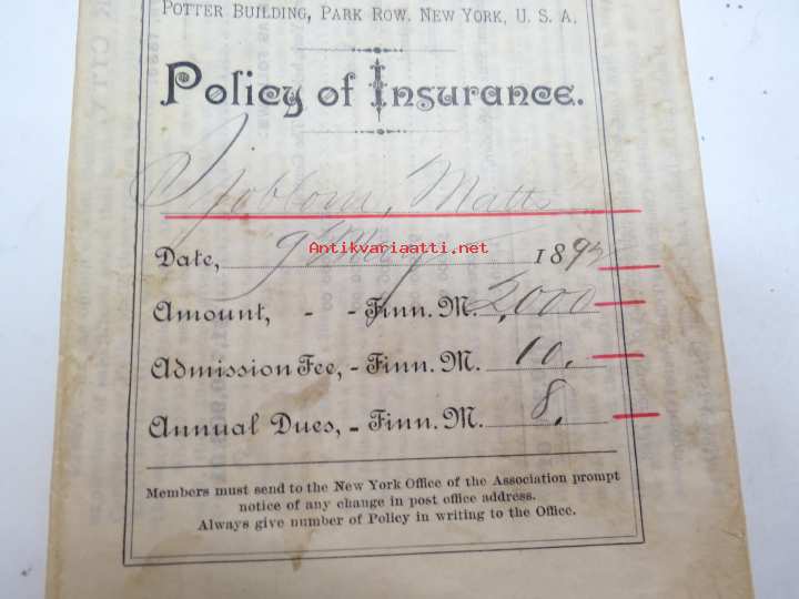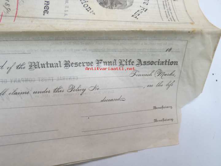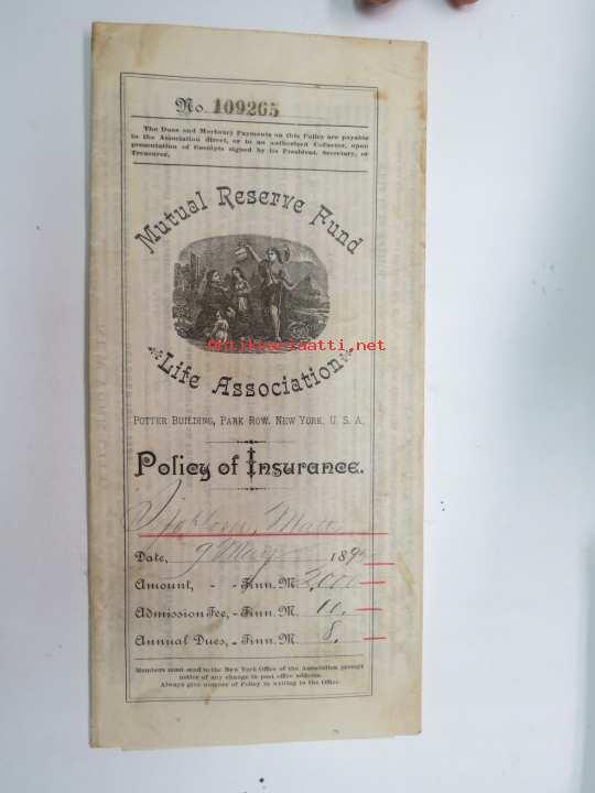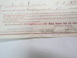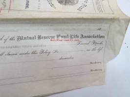 Mutual Reserve Fund Life Association (New York USA) Policy of Insurance - Matts Sjöblom, 9.5.1892, Lappo (Lappohja), 2 000 Smk -henkivakuutusasiakirja, Suomessa