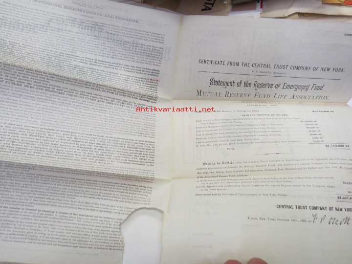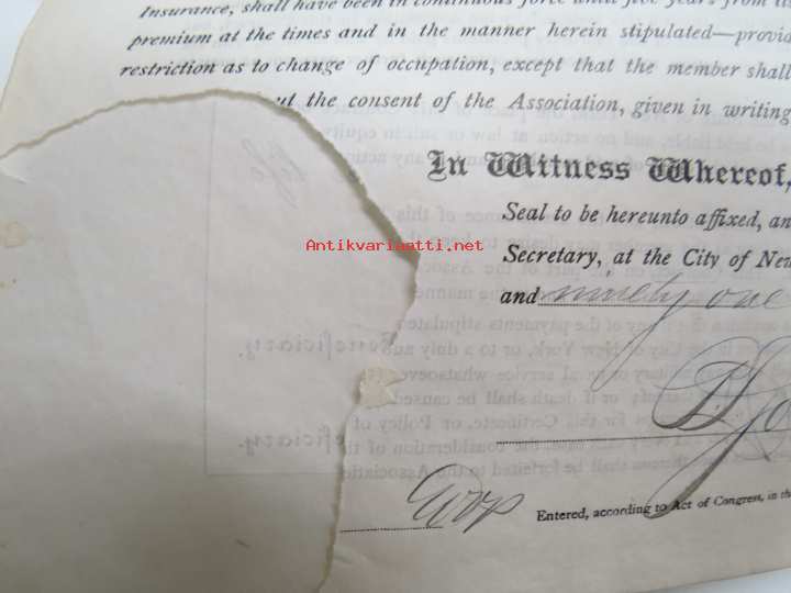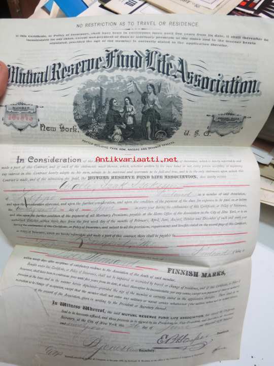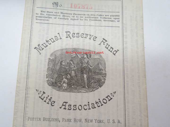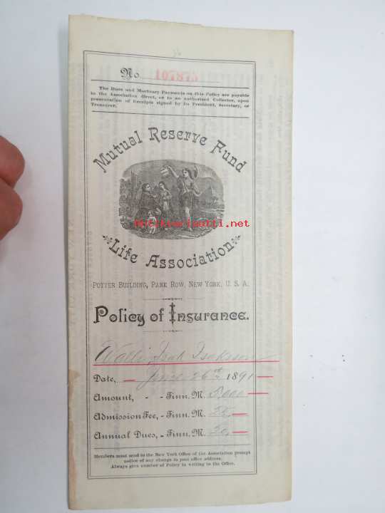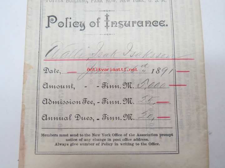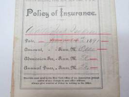 Mutual Reserve Fund Life Association (New York USA) Policy of Insurance - Isak Isaksson Walli, 26.6.1891, Lappo (Lappohja), 5 000 Smk -henkivakuutusasiakirja,