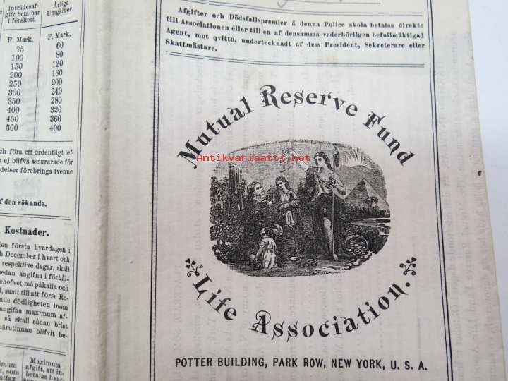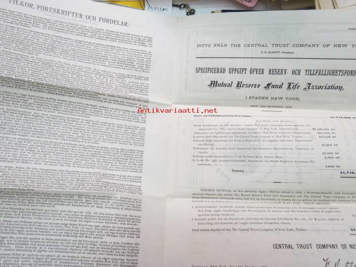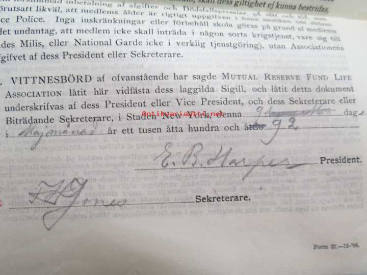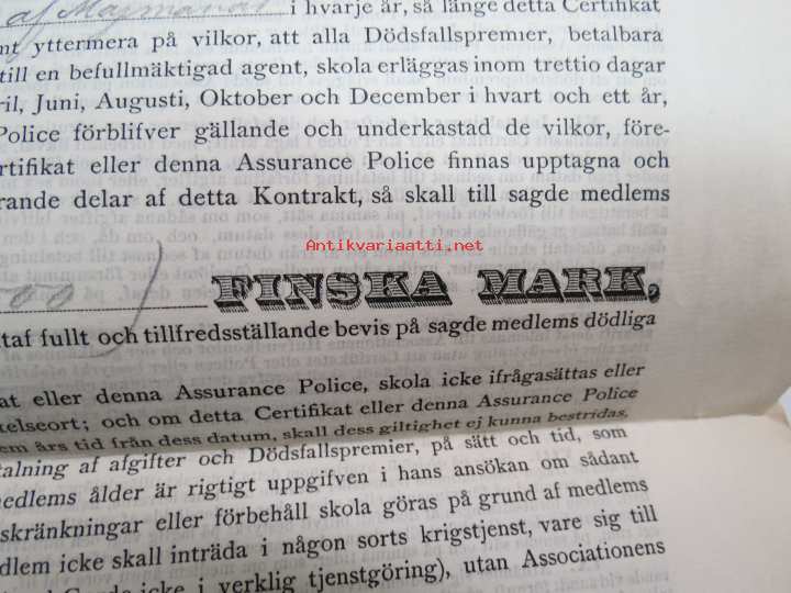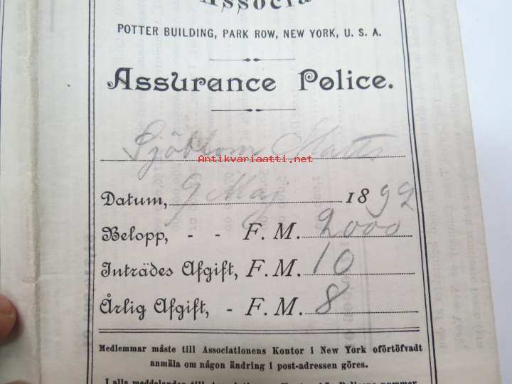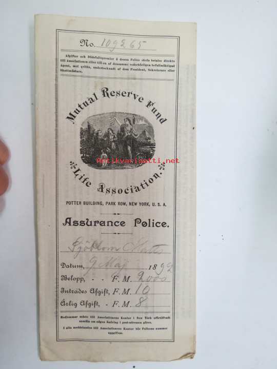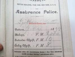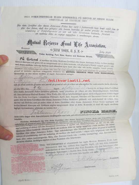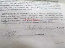 Mutual Reserve Fund Life Association (New York USA) Policy of Insurance - Matts Sjöblom, 9.5.1892, Lappo (Lappohja), 2 000 Smk -henkivakuutusasiakirja, Suomessa