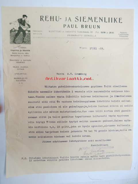Rehu- ja siemenliike Paul Bruun, Torkkelinkatu Viipuri 17.11.1923 -asiakirja
