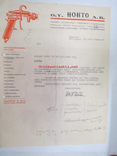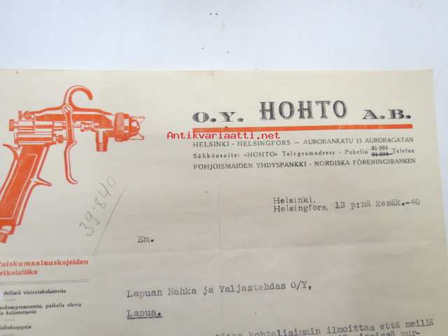 Oy Hohto Ab, Helsinki, 13.6.1940 -asiakirja