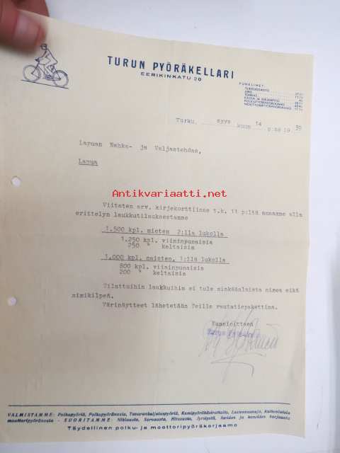 Turun Pyöräkellari, Turku, 14.9.1939 -asiakirja