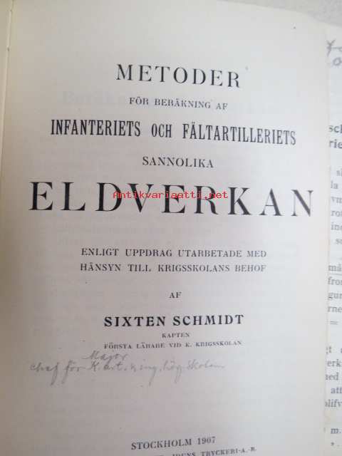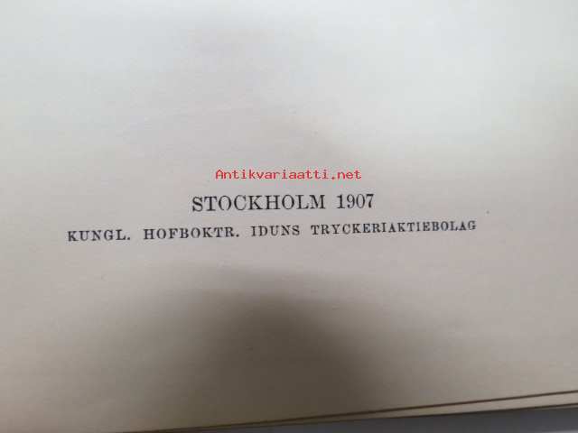 | Saatavilla | 1 kpl | | Julkaisuvuosi | 1907 | | Sivuja | 159 | | Painos | 1. | | Kunto | K2 | | Sidonta/painoasu | Sidottu (kovak.) | | Kielet | Ruotsi |