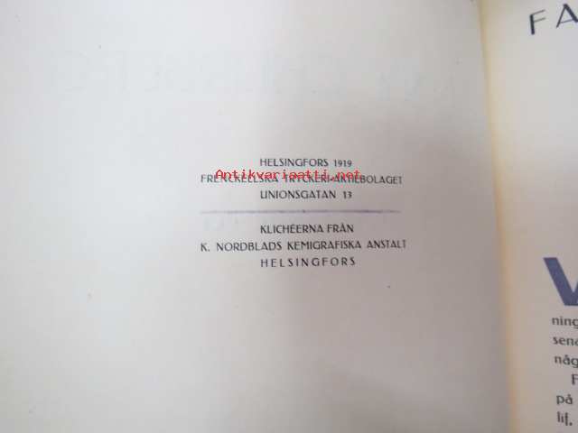 | Saatavilla | 1 kpl | | Julkaisuvuosi | 1919 | | Sivuja | 48 | | Painos | 1. | | Kunto | K2 | | Sidonta/painoasu | Nidottu (pehmeäk.) | | Kielet | Ruotsi |